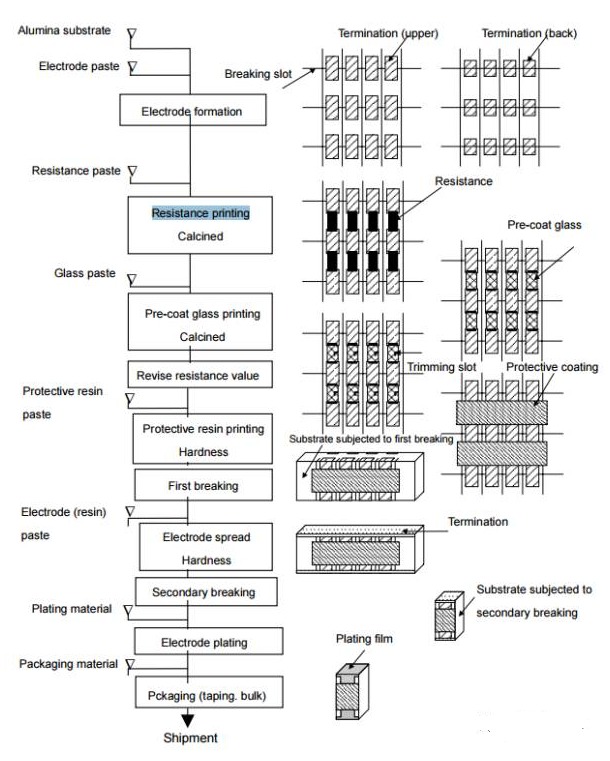 厚膜電阻采用的絲網印刷法,就是再陶瓷基底上貼一層鈀化銀電極,然后在電極之間印刷一層二氧化釕作為電阻體。厚膜電阻的電阻膜通常比較厚,大約100微米。具體工藝流程如下圖所示。