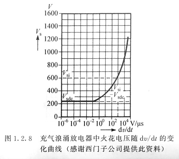充氣浪涌放電器的一個缺點是其對過壓應力的反應速度相對慢。等離子體的形成過程是相當慢的,而起弧電壓與dv/dt有關。如圖1.2.8所示,一個典型的270V裝置中起弧電壓是dv/dt的函數,這種效應在瞬變尖峰沖擊速率為10V/us時是非常明顯的,因此,對快速瞬變過程來說,充氣浪涌放電器必須有濾波器或快速反應的鉗位裝置的支持。