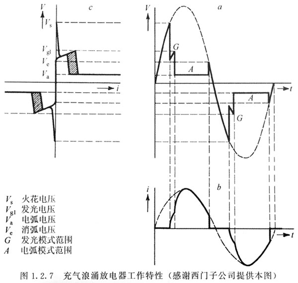 充氣浪涌放電器 大得多的瞬變電流可由各種氣體放電抑制器進行處理。在這類抑制器中,兩個或更多的電極在密封的高壓情性氣體環境里被精確地設置了間距。當放電器兩端電壓超過起弧電壓時,電極之間首先發生電離輝光放電。隨著電流的增大,會發生電弧放電,這就為所有的內部電極之間提供了一條低阻抗的通道。在此模式下,放電器有一條電壓幾乎恒定的傳導路徑,典型的電弧壓降是25V,放電器的特性見圖1.2.7。注意到其特點是高起弧電壓和低電弧壓降。 當沖擊電壓到來時,放電器電極僅維持很小的電壓,有效地短路電源適配器。此工作模式的內部損耗很小,一個相當小的器件也能承擔兒千安培的電流。使用這種類型的抑制器,保護作用不是把能量消耗在器件的內部而是器件的短路作用,短路迫使瞬變能量消耗在電力線和濾波器的串聯電阻上。