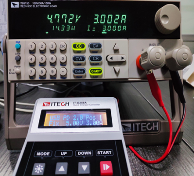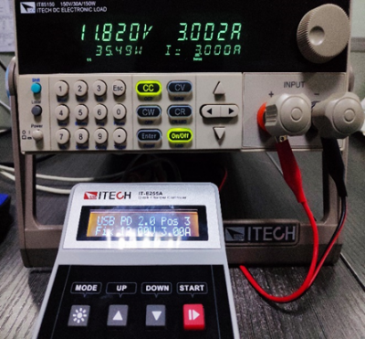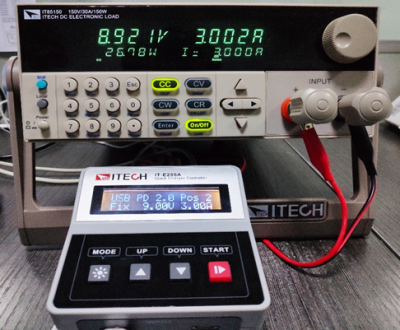 | 今年是USB 充電器爆發的一年。無論是手機、平板、還是筆記本電腦,越來越多的消費類電子產品都不約而同的用上了TYPE-C接口,支持USB PD充電協議。 一款快充充電器好不好,首當其沖的肯定是兼容情況,其次是輸出帶載能力。 較近購買一款小米45W的PD充電器,同時兼容QC2.0、QC3.0快充協議。 市面上多數電子負載并不支持快充協議,而艾德克斯電子新出的IT-E255A快充控制盒卻可以搭配目前多數電子負載進行快充協議的測試。 這個小小的快充控制盒不僅支持QC2.0/QC3.0/PE/PE2.0/USB PD,更重要的是竟然可以和艾德克斯的IT8500+系列的電子負載通信,設定負載的拉載模式和拉載值。 下面就和小伙伴們一起分享小米USB-C充電器的測試。 1.開始準備階段 IT-E255A的輸入口有Mini-USB和TYPE-C 2個接口。 充電器插入口,IT-E255A連上電子負載,測試就可以開始嘍。 1.1 IT-E255A自動進行充電器協議檢測,Type-C輸出口支持USB PD2.0 、QC3.0、QC2.0三種快充協議。 1.2 從IT-E255A顯示屏中可以看出,小米USBPD充電器的快充協議版本為2.0,支持5V/3A、9V/3A、12V/3A、15V/3A、20V/2.25A五個輸出檔位。 1.3 在5V/3A、9V/3A、12V/3A、15V/3A、20V/2.25A五個PD輸出檔位,分別拉載較大的電流,測試其在不同檔位下輸出的電壓和輸出功率。 ![]() 歐規充電器測試接線圖(小米充電器+ 艾德克斯IT-E255A + 艾德克斯IT85150) USB PD 2.O POS1 5V/3A ![]() USB PD 2.O POS2 9V/3A ![]() USB PD 2.O POS3 12V/3A ![]() USB PD 2.O POS4 15V/3A ![]() USB PD 2.O POS5 20V/2.25A ![]() 2.手動按鍵按下“Mode”,選擇QC3.0,點擊“START”,IT-E255A則可誘導小米USB-C充電器從5.0V開始以0.2V的步進值步進,充電器可按照快充控制盒的設定值輸出。 2.1 在QC3.0模式下,誘導充電器輸出6.0V、7.0V、8.0V、9.0V,分別使用電子負載恒流模式拉載,測試其電壓、輸出功率。 ![]() 3. 如果不喜歡手動操作,還可以使用上位機軟件控制。 使用USB數據線將IT-E255A和計算機相連。下載相應免安裝的上位機軟件,打開后就可以使用。 下面做了兩個測試:QC2.0 9.0V輸出: QC2.0 12.0V輸出: ![]() 操作清晰簡易,可以顯示拉載的電壓、電流、功率的波形曲線,自由控制電子負載, 另外還可以設置list自動測試,快速進行判斷、OCP測試等。此外還可以下載到快充控制盒中,與電腦脫機使用,一鍵操作,非常快捷。