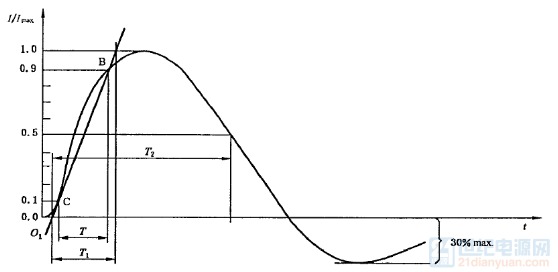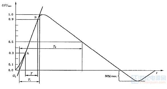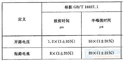 | 首先介紹一下什么是浪涌。浪涌一般是在開關(guān)瞬態(tài)或者雷電瞬態(tài)過程中產(chǎn)生的。 浪涌測試的官方叫法是“浪涌(沖擊)抗擾度實驗”; 測試標(biāo)準(zhǔn)參考IEC61000-4-5,或者GB/T 17626.5;該標(biāo)準(zhǔn)里面有詳細(xì)闡述了有關(guān)浪涌的知識。 我們在測電源適配器浪涌時,由浪涌發(fā)生器輸出的波形是一種組合波:1.2/50us電壓波(開路電壓)和8/20us電流波(短路電流),發(fā)生器的等效阻抗是2歐姆,用開路電壓峰值除以短路電流峰值就是該等效阻抗。具體波形參考下面兩圖: 1.2/50us開路電壓波,1.2us是波形的上升時間,具體指波形從10%上升到90%所用的時間,50us是半峰值時間,具體指波形上升至50%到波形下降至50%的時間,用示波器測量設(shè)備的開路波形就是這樣的。 ![]() 8/20us短路電流波,8us是波形的上升時間,20us是半峰值時間,具體定義同上,將設(shè)備的輸出端短路,測試短路電流就是這樣的波形。 ![]() 這幾個時間及開路電壓峰值、短路電流的誤差見下表: