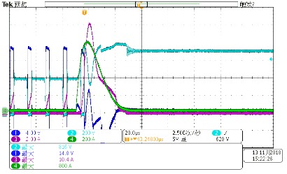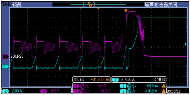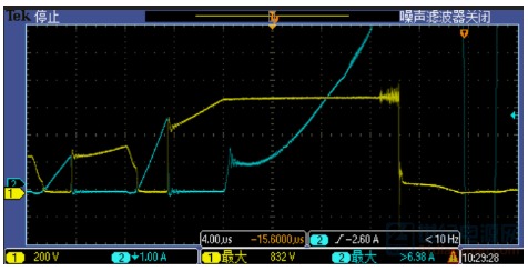 較后對比兩個設(shè)備的波形發(fā)現(xiàn),一個偏上限,一個偏下限,都沒有超出標(biāo)準(zhǔn)范圍。其實標(biāo)準(zhǔn)范圍大了,方便了造設(shè)備的。 今天剛給一個LED電源適配器打完4kV浪涌,附上4kV浪涌時,MOS管的波形,供參觀,下次再見: ![]() CH1-深藍(lán)色-VGS波形, CH2-淺藍(lán)色-VDS波形,較大816V, CH3-紫色-IDS波形,較大10.4A, CH4-綠色-L線電流波形,較大800A。 LED八字尾電源適配器-單級PFC結(jié)構(gòu),由于沒有大電解,在打浪涌時,浪涌能量很容易傳遞到功率MOS上。浪涌對MOS管的沖擊失效一般有兩種失效模式: 1-浪涌引起MOSFET 電流應(yīng)力超過額定值,導(dǎo)致失效; 根據(jù)伏秒平衡定律,反激開關(guān)電源適配器變壓器電感: 公式1 ![]() 其中Von=Vin,D為占空比,r=0.3-0.5,fsw指開關(guān)頻率,IL是電感電流。Von一般較大277Vac或者300Vac,但是在浪涌脈沖測試時,由于母線電壓突然升高,超過設(shè)計輸入電壓較高值1.2倍或者更多,變壓器電感會迅速出現(xiàn)飽和。下圖1中紫色電流在開關(guān)周期后階段出現(xiàn)飽和跡象,MOSFET電流應(yīng)力迅速上升達(dá)到7.32A。在正常開關(guān)周期,MOSFET IDS=3A。器件在高電流、高電壓應(yīng)力發(fā)生雪崩,MOSFET失效,表現(xiàn)為短路,引起開關(guān)電源適配器輸入端保險絲,整流橋和驅(qū)動IC失效。 ![]() ![]() 圖1浪涌測試 紫色MOSFET IDS 黃色是VDS 圖2浪涌測試 紫色VDS電壓 ,藍(lán)色是IDS SJ-MOSFET 0.3Ω/700V 10A80E VD-MOSFET EAS=454mJ 2-浪涌引起MOSFET 電壓應(yīng)力超過極限值,導(dǎo)致失效 開關(guān)電源適配器在浪涌測試時,由于前端浪涌吸收器件(壓敏電阻等)規(guī)格參數(shù)偏小導(dǎo)致母線電壓迅速爬升,進(jìn)而導(dǎo)致MOSFET電壓應(yīng)力迅速超過額定電壓1.1-1.2倍,MOSFET器件會迅速進(jìn)入雪崩,IDS電流瞬間變大,導(dǎo)致器件功耗急劇增加,巨大的功耗轉(zhuǎn)換為溫升超過芯片極限溫度而引起失效。如圖2所示,60W 單級PFC LED電源適配器, 1.5KV 差模浪涌測試失效波形。結(jié)合圖3更準(zhǔn)確說明此類問題,圖3所示黃色曲線電壓低于680V時,MOSFET處在關(guān)斷狀態(tài),IDS幾乎等于0;一旦超過680V,MOS管反向擊穿,電壓被嵌位,IDS電壓迅速爬升,后面器件由于熱量失控而導(dǎo)致失效。 ![]() ![]() 圖316N65A VD-MOSFET EAS=1000mJ 圖416N65A 規(guī)格書極限參數(shù) EAS=1000mJ 黃色線是MOSFETVDS電壓,藍(lán)色是IDS 浪涌失效瞬間,MOSFET短路,隨后繼續(xù)流過大電流,燒毀其他器件,尤其是采樣電阻較易燒壞,再燒斷保險司或者其他線路,使電源適配器與輸入斷開。 一般都是芯片被嚴(yán)重?zé)齻娤聢D。 ![]() 圖5 浪涌失效芯片外觀 圖6 浪涌失效芯片外觀