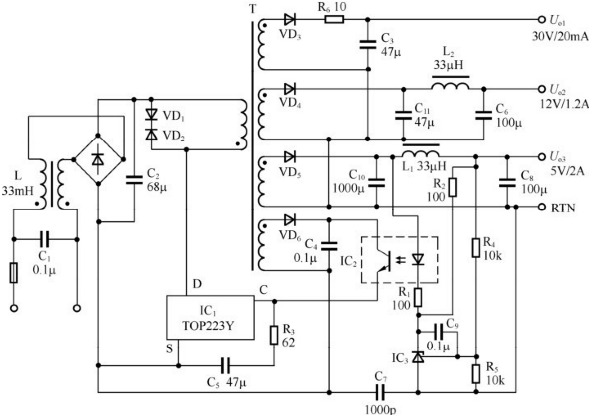 | 在各類(lèi)電子設(shè)備中,不同的用電系統(tǒng)不僅對(duì)各種電壓組合有嚴(yán)格的要求,而且對(duì)這些電源電壓的諸多電特性也有較嚴(yán)格的要求,如電壓精度、負(fù)載能力(輸出電流)、電壓的紋波和噪聲、啟動(dòng)延遲、上升時(shí)間、恢復(fù)時(shí)間、電壓過(guò)沖、斷電延遲時(shí)間、跨步負(fù)載響應(yīng)、跨步線性響應(yīng)、交叉調(diào)整率、交叉干擾等。 對(duì)于電源適配器應(yīng)用都希望只要負(fù)載不超過(guò)較大值,無(wú)論系統(tǒng)的各路負(fù)載特性如何變化,而各路電源電壓依然精確無(wú)誤。僅就這一點(diǎn)來(lái)講,目前絕大多數(shù)的多路輸出電源的特性不夠理想。 從圖可以看到,真正形成閉環(huán)控制的只有主電路(Up),其他的Uaux1、Uaux2等輔助電路都處于失控狀態(tài)。由控制理論可知,只有Up無(wú)論輸入、輸出如何變動(dòng)(包括電壓變動(dòng)、負(fù)載變動(dòng)等),在閉環(huán)的反饋控制作用下都能保證相當(dāng)高的精度(一般優(yōu)于0.5%),也就是說(shuō)Up在很大程度上只取決于基準(zhǔn)電壓和采樣比例。對(duì)Uaux1、Uaux2而言,其精度主要依賴(lài)以下幾個(gè)方面。 ![]() ①T1的匝比,這里主要取決于Np1∶Np2或Np1∶Np3。 ②輔助電路的負(fù)載情況。 ③主電路的負(fù)載情況。 以上3點(diǎn)設(shè)定后,輸入電壓的變動(dòng)對(duì)輔助電路的影響已經(jīng)很有限了。在以上3點(diǎn)中,作為一個(gè)具體的電源適配器變換器,主變壓器的匝比已經(jīng)設(shè)定,所以影響輔助電路輸出電壓精度較主要的因素為主電路和輔電路的負(fù)載情況。在電源適配器產(chǎn)品中有專(zhuān)門(mén)的技術(shù)指標(biāo)說(shuō)明和規(guī)范電源的這一特性,即交叉負(fù)載調(diào)整率。 根據(jù)圖所示原理組成的實(shí)際電源適配器,其主控電路僅反饋主輸出電壓,其他輔助電路完全放開(kāi)。此時(shí)假設(shè)主、輔電路的功率比為1∶1,實(shí)際測(cè)得主電路交叉負(fù)載調(diào)整率優(yōu)于0.2%,而輔助電路的交叉負(fù)載調(diào)整率大于50%。如何降低輔電路交叉負(fù)載調(diào)整率,較直接的方法就是給輔助電路加一個(gè)線性穩(wěn)壓調(diào)節(jié)器(包括三端穩(wěn)壓器和低壓差三端穩(wěn)壓器)。設(shè)計(jì)中應(yīng)堅(jiān)持的原則如下。 ①主電路實(shí)際使用的電流較小應(yīng)為較大輸出電流的30%。 ②主電路電壓精度應(yīng)優(yōu)于0.5%。 ③輔助電路的功率較好小于主電路功率的50%。 ④輔助電路的交叉負(fù)載調(diào)整率不大于10%。 1.多路輸出電路方案 (1)確定多路輸出的技術(shù)指標(biāo) 假定要設(shè)計(jì)的電源適配器具有3路輸出:主輸出Uo1(5V,2A,10W)以及輔助輸出為Uo2(12V,1.2A,14.4W)和Uo3(30V,20mA,0.6W)。總輸出功率為25W,技術(shù)指標(biāo)見(jiàn)表。 ![]() 各路輸出的穩(wěn)壓性能對(duì)于電路結(jié)構(gòu)和高頻變壓器的設(shè)計(jì)至關(guān)重要。通常,主輸出的穩(wěn)定性要高于輔助輸出?,F(xiàn)將+5V作為主輸出,其負(fù)載調(diào)整率SI≤±1%,其余兩路優(yōu)于±5%。 (2)確定反饋電路 多路輸出的反饋電路有4種類(lèi)型:基本反饋電路、改進(jìn)型基本反饋電路、配穩(wěn)壓管的光耦反饋電路和配TL431的光耦反饋電路。其中第四種電路的穩(wěn)壓性能較好。利用表可選定反饋電路。 表可供多路輸出選擇的4種反饋電路 ![]() ①基本反饋電路是利用反饋繞組間接獲取輸出電壓的變化信號(hào),因此不需要使用光耦合器。該方案的電路較為簡(jiǎn)單,但電源適配器的穩(wěn)定性不高,難以把負(fù)載調(diào)整率SI降至±5%以下。若僅為改善輕載時(shí)的負(fù)載調(diào)整率,可在輸出端并聯(lián)一只合適的穩(wěn)壓管,使其穩(wěn)定電壓UZ=Uo1,此時(shí)輕載下的SI<±5%。 ②改進(jìn)型(亦稱(chēng)增強(qiáng)型)基本反饋電路的特點(diǎn)是在反饋電路中串聯(lián)一只22V的穩(wěn)壓管,再并聯(lián)一只0.1μF電容器。 ③配穩(wěn)壓管的光耦反饋電路是利用一只穩(wěn)壓管的穩(wěn)定電壓作為次級(jí)參考電壓,由穩(wěn)壓管的穩(wěn)定電壓(UZ)、光耦合器中LED的正向壓降(UF)和用于控制環(huán)路增益的串聯(lián)電阻R1上的壓降(UR1)三者之和來(lái)決定輸出電壓值。當(dāng)UZ的偏差小于2%時(shí),能將主輸出的負(fù)載調(diào)整率控制在±2%以?xún)?nèi),該電路的缺點(diǎn)是參考電壓的穩(wěn)定度不高,并且只對(duì)主輸出進(jìn)行反饋,其他各路輔助輸出未加反饋,因此輔助輸出的電壓穩(wěn)定性較差。 ④配TL431的多路輸出光耦反饋電路是利用TL431型可調(diào)式精密并聯(lián)穩(wěn)壓器構(gòu)成次級(jí)誤差電流放大器,再通過(guò)光耦合器對(duì)主輸出進(jìn)行精確的調(diào)整。除主輸出作為主要的反饋信號(hào)之外,其他各路輔助輸出也按照一定比例反饋到TL431的2.50V基準(zhǔn)端,這對(duì)于全面提高多路輸出式電源適配器的穩(wěn)壓性能具有重要意義。 電源適配器電路設(shè)計(jì) 根據(jù)上述原則設(shè)計(jì)的多路輸出式25W電源適配器電路如圖9-2所示。該電路采用一片TOP223Y型三端單片電源適配器芯片,交流輸入電壓的范圍是85~265V。高頻變壓器的次級(jí)有3個(gè)獨(dú)立繞組,僅在主輸出端(±5V)設(shè)計(jì)了帶TL431的光耦反饋電路。多路輸出式電源適配器有以