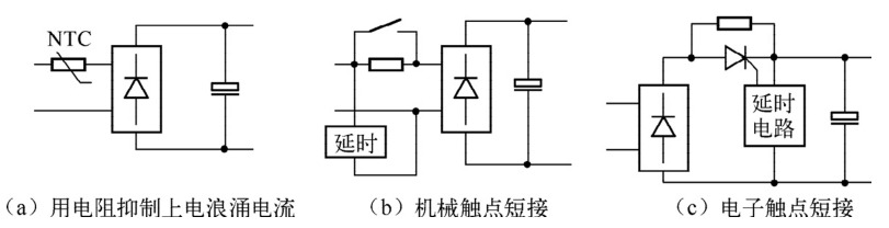 | 電源適配器上電時,由于濾波電容器的電壓基本為零(相當于短時短路),如果正好是電源適配器電壓峰值,則輸入電流峰為輸入浪涌峰值電流值,為輸入電壓峰值除以線路內阻。由于線路內阻通常很小,所以將會產生數十倍正常電流的浪涌電流。即使在城市民用供電條件下,浪涌電流峰值將會達100A!即使在電源適配器電壓過零時,上電仍有約十倍的浪涌電流。 上電浪涌電流的危害為:出現浪涌電流時會造成電源適配器電壓波形塌波,造成供電質量變差,甚至會影響其他用電設備的工作,以及供電電流的保護電路動作;由于浪涌電流的沖擊,整流器的輸入熔斷器在若干次上電過程的浪涌電流沖擊下熔斷,而非由于過載/短路熔斷。為了避免這類現象的發生,不得不選用更高額定電流的熔斷器,但將出現過載時熔斷器不能熔斷的情況,起不到保護整流器及用電電路的作用;過高的上電浪涌電流對整流器和濾波電容器造成不可逆的損壞。因此,必須對帶有電容濾波的整流器輸入浪涌電流加以限制。 通常,限制上電浪涌電流較簡單有效的方法是:在整流器與濾波電容器之間或在整流器的輸入側加一負溫度系數熱敏電阻(NTC),如圖(a)所示,利用負溫度系數熱敏電阻上電前在常溫狀態下的較高阻值限制上電浪涌電流。上電后,由于NTC上流過電流,并消耗電能發熱,使其電阻值降低以減小NTC上的損耗。這種方法的特點是簡單,但存在的問題是限制上電浪涌電流性能受環境溫度和NTC的初始溫度影響。因此,在環境溫度較高或并機、在上電時間間隔很短時,NTC起不到限制上電浪涌電流的作用。因此,這種限制上電浪涌電流方式僅用于價格低廉的微機電源適配器或其他低成本電源適配器。而在一些彩色電視機和顯示器上,限制上電浪涌電流則采用串一限流電阻的方法,電路如圖2.2(b)所示,較常見的應用是彩色電視機,這種方法的優點是簡單、可靠性高,允許在寬環境溫度范圍內和電視內在較高溫度可達60℃以上正常工作,其缺點是限流電阻上有損耗,降低了電源效率。事實上,整流器上電處于穩態工作后,這一限流電阻的限流作用已完成,僅起到消耗功率、發熱的副作用。因此,在功率較大的開關電源中采用上電經一個延時后用一個機械觸點或電子觸點將限流電阻短路,電路如圖所示