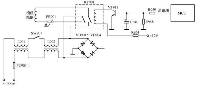 | 電源適配器在高電壓下,較大功率的電源適配器同時也工作在大電流狀態(tài)下,并且受到浪涌電流和高壓脈沖的威脅,加之電源適配器電路復雜,因此,電源適配器除了一般電子線路外,還要設置多種特殊保護電路,以此保證電源適配器穩(wěn)定工作。 消磁電路 地磁和外部磁場會影響一些電器的正常工作,因此,一些特殊的電器,如CRT彩電、CRT顯示器等,其電源適配器中會設有消磁電路。 消磁電路的主要元件是消磁電阻,消磁電阻是一種正溫度系數(shù)(PTC)的熱敏電阻,用于對顯像管的消磁。其阻值能隨溫度升高而迅速增大。利用PTC熱敏電阻充當消磁元件,具有節(jié)能、安全、方便、低成本的特點。 地磁和外界各種雜散磁場對彩色顯像管有磁化作用,顯像管的蔭罩、柵網、防爆環(huán)、外屏蔽罩和固定件極容易被磁化。磁化的結果將改變電子束軌跡,使色純不良,并引起會聚誤差,有時甚至使屏幕上出現(xiàn)明顯的色斑。為了克服地磁場、周圍雜散磁場以及機內金屬零部件形成的磁場對顯像管內電子束的影響,設有一套消磁電路。該電路在每次開機時,產生一個由強變弱的交變磁場,對顯像管金屬部件進行消磁。 消磁電路主要有常規(guī)消磁電路和MCU控制消磁電路兩種,下面分別進行介紹。 1.常規(guī)消磁電路 常規(guī)消磁電路由PTC熱敏電阻和消磁線圈構成。圖是常規(guī)消磁電路原理圖。 ![]() 將消磁電阻、消磁線圈串聯(lián)后裝在顯像管防爆帶附近,開機通過高達20A的起始電流而迅速發(fā)熱,并使其自身阻值突變增高,30s后的殘余電流值降低至10mA以下,使消磁電路產生一個逐漸衰減的交變強磁場,達到消除熒屏剩磁的目的。 2.MCU控制消磁電路 MCU(微控制器)控制消磁電路是一種新式消磁電路,它是在常規(guī)消磁電路的基礎上增加了一個消磁控制電路,該控制電路工作時間由MCU單獨設置的控制端子進行控制。圖2-15所示為MCU控制消磁電路原理圖。 ![]() 圖MCU控制消磁電路原理圖 在接通電源適配器開關后,MCU進入工作狀態(tài),其消磁控制端輸出高電平消磁信號,三極管VT911導通,繼電器線圈得電,繼電器常開觸點閉合,將消磁電阻、消磁線圈接入市電回路中,于是,市電電壓經消磁電阻限流,在消磁線圈中產生交變磁場,對顯像管及其附件進行消磁。數(shù)秒后,MCU消磁控制端為低電平,控制電路停止工作,使消磁回路被切斷。這樣不但降低了消磁電阻的故障率,而且提高了消磁電路的工作效率。