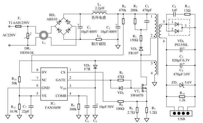 圖為USB手機(jī)充電器電路原理圖,采用Fairchild公司出品的一次繞組反饋(PSR(3))控制器FAN104W。 ![]() 變莊器上的一繞組線,通過這個(gè)繞組上的電壓、電流變化確定電路的工作情況,從而來調(diào)整電路的工作穩(wěn)定。一次繞組反饋(PSR)與傳統(tǒng)二次繞組反饋光耦和TL431的結(jié)構(gòu)相比,節(jié)約了電路板上的空間,降低了成本。在省去了光耦和TL431等元器件之后,為了實(shí)現(xiàn)高精度的恒流/恒壓(CC/CV)控制特性,必然要采用新的技術(shù)來監(jiān)控負(fù)載、電源和溫度的實(shí)時(shí)變化及元器件的同批次容差,這就涉及一次繞組調(diào)節(jié)技術(shù)、變壓器容差補(bǔ)償、線纜補(bǔ)償和EMI優(yōu)化技術(shù)。 (1)高壓?jiǎn)?dòng) 市電經(jīng)F1(延時(shí)保險(xiǎn)絲)輸入,經(jīng)DR1(綠色壓敏電阻)過壓保護(hù)和共模扼流圈L1送給DB1進(jìn)行全波整流。高壓電容C1、C2與電感L3構(gòu)成π形濾波電路,貼片磁阻L2用于濾除差模干擾。直流母線通過電阻R4(推薦值為100kΩ)連接至FAN104的8腳(HV)。初始上電時(shí),內(nèi)部高壓電流源開啟,為HV引腳提供輸入電流IHV,對(duì)電源端VDD外接電容C9充電。當(dāng)VDD電壓達(dá)到IC開啟電壓VDD-ON時(shí),內(nèi)部高壓電流源被禁用,阻止IHV流入HV引腳。 IC開啟后(在PWM輸出之前),C9是提供IC消耗電流的電能來源。因此,C9必須足夠大(推薦值為22μF),以便在輔助繞組輸出電壓之前阻止VDD降至IC關(guān)斷電壓VDD-OFF。正常工作時(shí),由輔助繞組經(jīng)VD6、C9整流濾波給FAN104供電。 (2)FAN104W引腳功能 該高度集成的PWM控制器FAN104W具備多種功能,可增強(qiáng)低功率反激轉(zhuǎn)換器的性能。FAN104W專有的拓?fù)浣Y(jié)構(gòu)簡(jiǎn)化了電池充電器應(yīng)用中的電路設(shè)計(jì)。與常規(guī)設(shè)計(jì)或線性變壓器相比,這樣的充電器具有更低的成本、更加小型化,也更加輕便。FAN104W各引腳功能說明見表。 表FAN104W各引腳功能說明