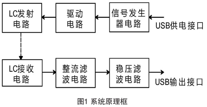 無線手機充電器硬件由發射部分和接收部分組成。為了更好地保證 與原來的充電器接口兼容,發射部分選用USB進行輸電,由信號發生器電路、驅動電路、LC發射電路組成,接收部分由LC接收電路、整流濾波電路、穩壓濾波電路組成,接收部分選用USB接口形式輸出,有利于手機連接充電器。整體系統原理框如圖1所示。
