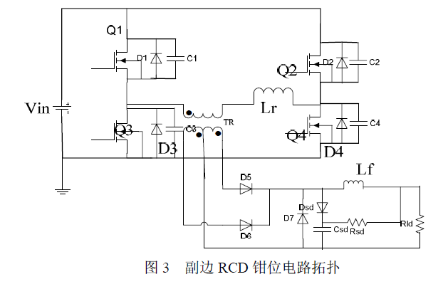 該電路在變壓器原邊增加一個諧振電感和兩個鉗位二級管,消除了輸出整流管上的電壓尖峰和電壓振蕩,從而省去了吸收電路,可以選擇低壓的整流管,該電路的主要缺點是: 1)在原邊電壓為0 時,諧振電感被鉗位二極管短路,其電流保持不變,在電感鉗位二極管和開關管中產生較大的導通損耗; 2)增加了鉗位二極管的電流有效值和關斷損耗; 3)為了防止直流偏磁,一般采用隔直電容與變壓器或諧振電感串聯,但隔直電容上的直流分量會導致變壓器原邊電流或諧振電感電流不對稱,影響變換器的可靠工作。 上述電路的拓撲改進,把諧振電感和變壓器互換位置,使鉗位二極管在一個周期內只導通1 次,降低了鉗位二極管有效值,降低了導通損耗,進一步提高了變換器效率。 2.3 副邊RCD 鉗位電路拓撲 圖2 及其改進拓撲者是在原邊加鉗位二極管。另一種方法是在副邊加鉗位電路。圖3就是一改進的副邊RCD 鉗位電路拓撲,該電路能有效抑制副邊管的電壓過沖,同時導通損耗也較低,主要缺點是吸收電路損耗大,降低了變換器的效率。