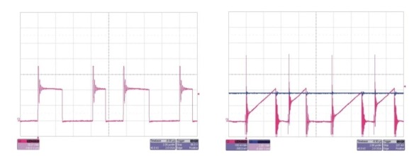 圖 2 兩種常見的電流模式噪聲問題 圖 2 顯示了電流斜坡存在的一些問 題。第一幅圖顯示了上升邊沿峰值和隨后 產(chǎn)生的電流斜坡。比較器(根據(jù)其不同速度) 具 有 兩 個 電 壓 結(jié) 點(diǎn) (potential trip points),結(jié)果是無序控制運(yùn)行,聽起來更 像是煎熏肉的聲音。 利用控制 IC 中的上升邊沿消隱可 以很好地解決這一問題,其忽略了電流波 形的較初部分。波形的高頻濾波也有助于 解決該問題。同樣也要將電容器盡可能近 地靠近控制 IC 放臵。正如這兩種波形表 現(xiàn)出來的那樣,另一種常見的問題是次諧 波振蕩。這種寬-窄驅(qū)動波形表現(xiàn)為非充 分斜率補(bǔ)償。向當(dāng)前斜坡增加更多的電壓 斜坡便可以解決該問題。盡管您已經(jīng)相當(dāng) 仔細(xì)地設(shè)計了電源布局,但是您的原型電 源還是存在噪聲。這該怎么辦呢?首先, 您要確定消除不穩(wěn)定因素的環(huán)路響應(yīng)不 存在問題。有趣的是,噪聲問題可能會看 起來像是電源交叉頻率上的不穩(wěn)定。但真 正的情況是該環(huán)路正以其較快響應(yīng)速度 糾出注入誤差。同樣,較佳方法是識別出噪聲正被注入下列三個地方之一:誤差放 大器、參考電壓或斜坡。您只需分步解決 便可!第一步是檢查節(jié)點(diǎn),看斜坡中是否 存在明顯的非線性,或者誤差放大器輸出 中是否存在高頻率變化。如果檢查后沒有 發(fā)現(xiàn)任何問題,那么就將誤差放大器從電 路中取出,并用一個清潔的電壓源加以代 替。這樣您應(yīng)該就能夠改變該電壓源的輸 出,以平穩(wěn)地改變電源輸出。如果這樣做 奏效的話,那么您就已經(jīng)將問題范圍縮小 至參考電壓和誤差放大器了。 有時,控制 IC 中的參考電壓易受開 關(guān)波形的影響。利用添加更多(或適當(dāng))的 旁路可能會使這種狀況得到改善。另外, 使用柵極驅(qū)動電阻來減緩開關(guān)波形也可 能會有助于解決這一問題。如果問題出在 誤差放大器上,那么降低補(bǔ)償組件阻抗會 有所幫助,因?yàn)檫@樣降低了注入信號的振 幅。如果所有這些方法都不奏效,那么就 從印刷電路板將誤差放大器節(jié)點(diǎn)去除。對 補(bǔ)償組件進(jìn)行架空布線 (air wiring) 可 以幫助我們識別出哪里有問題。