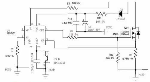 R11為lC工作頻率調(diào)整電阻, 02為輔助繞組供電整流二極管 R14為限流電阻, C5為低頻濾波電容, C11為高頻濾波電容, R3為過功電阻, R8為驅動電阻, R12 MOS開機保護電阻, C12為旁路電容, U3-B為光耦反饋端,