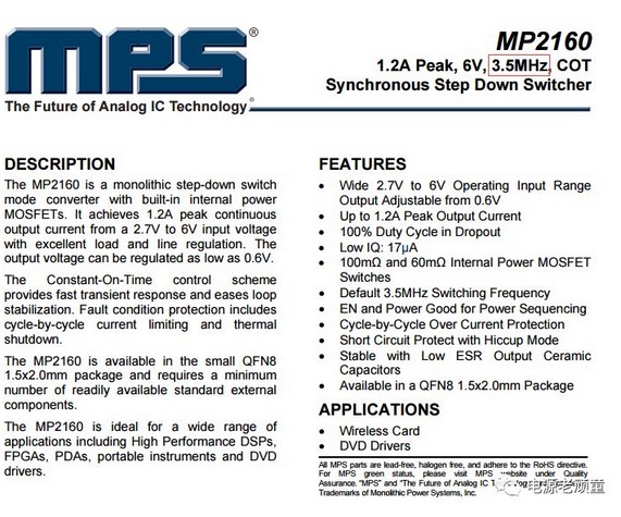 | 中小功率場合,我理解為0-10kW, 高頻理解為1-3Mhz。電源適配器廠家玖琪實業在研究超高頻20Mhz的開關電路,但是由于功率僅局限于20W之內,所以不再討論的話題之內(真實原因是我不懂,哈哈)。 電源適配器廠家對于將頻率提升特別謹慎,在高頻狀態下,寄生參數帶來的不確定性尤其難以預測,以下是美國MPS的MP2160,其頻率高達3.5M,堪稱DC-DC領域的跑車。
