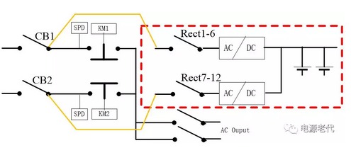 | 在處理完一次鐵路電源系統(tǒng)ATS故障后,曾向鐵路系統(tǒng)維護人員提出這樣一個優(yōu)化方案:電源適配器整流模塊全實時在線,更是大大提高系統(tǒng)可靠性! 改造前原系統(tǒng)方案如下: ![]() 圖5.1 電源適配器CC級ATS組成系統(tǒng)示意圖 圖5.1為艾默生網(wǎng)絡(luò)能源有限公司PS48600-3/2900-X4系統(tǒng)示意圖,可看出:電源適配器輸入兩路交流市電經(jīng)CC級ATS后到交流母線,交流有幾個支路帶交流負載,其余主要是給直流系統(tǒng)用(如紅色框中部分); 直流系統(tǒng)是整個電源的核心,需要優(yōu)先保證其可靠性;而直流系統(tǒng)的交流輸入經(jīng)與ATS串聯(lián)后,可靠性大大下降。 5.2 改造后系統(tǒng)方案如下: 5.2.1 兩路市電經(jīng)原電源適配器系統(tǒng)主空氣開關(guān)CB1、CB2后仍接ATS; 5.2.2 艾默生防雷接在ATS前端,且每路市電配一個,所以防雷部分利舊; 5.2.3 原ATS輸出到整流模塊輸入空開匯流排的線&整流模塊輸入空開匯流排拆除; 5.2.4在ATS上端子或CB1輸出端子分別引輸入電纜,直接連到各整流模塊輸入空氣開關(guān); 5.2.5 改造后,只要市電1、市電2任一路有電或都有電,直流母排始終有電,無任何切換,重要的部分可靠性大大提高! 改造后的系統(tǒng),因兩路完全在線,對電池要求可降低; 改造后,ATS觸點不走大電流,ATS自身故障率將降低,也提高交流負載供電可靠性! ![]() 圖5.2 改造后系統(tǒng)原理示意圖 電源適配器改造方案說明(只是說明工作量和原理) 圖5.3 改造示意圖 保證電源適配器模塊1-6和7-12位置均有相近數(shù)量的模塊;因兩路市電一路優(yōu)先,因此一般是市電一工作;斷開CB2及CB2上級空氣開關(guān),斷開Rect7-12模塊輸入空氣開關(guān)(依據(jù)負載功率,可以是兩只或三只甚至更多),接圖5.3中黃線所示位置接線;接好線后繼續(xù)保持Rect7-12空氣開關(guān)斷開(改線的幾個都保持斷開); 電源適配器送CB2上級交流電、維持CB2、Rect2空開斷開狀態(tài):此時,不管ATS狀態(tài),只要交流2有電,負載就一直正常; 5.3.3 斷開CB1及上級空氣開關(guān),接圖5.3.3綠色線示意,接模塊1-6電纜; ![]() 圖5.3.3電源適配器接線過程 在5.3.3電源適配器部分接線完成,合CB1及上級空開,此時模塊1—6工作將正常,此時系統(tǒng)結(jié)構(gòu)將如5.3.4所示; 5.3.4 接線過程 5.3.5 將CB2及上級空開斷開,同理接Rect7-12模塊空開至CB2下端子線,接好后如圖5.3.5所示,送CB2及上級空開,模塊7-12將正常工作; 圖5.3.5 接線完成后 5.3.6 至此,改造順利完成; 文章轉(zhuǎn)載自網(wǎng)絡(luò),如有侵權(quán),請聯(lián)系刪除。 |