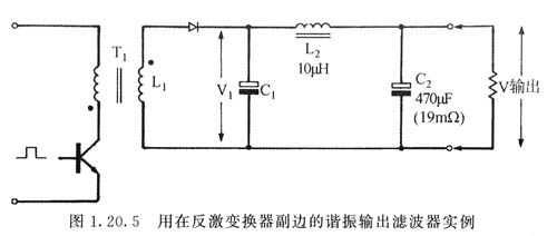 圖是一個其參數(shù)為30kHz、5V和10A且具有兩級LC輸出濾波器的反激變換器的典型輸出級。在反激變換器中,變壓器的電感與C1組成了第一級LC充電器濾波器,第二級濾波器是由L和C2組成。