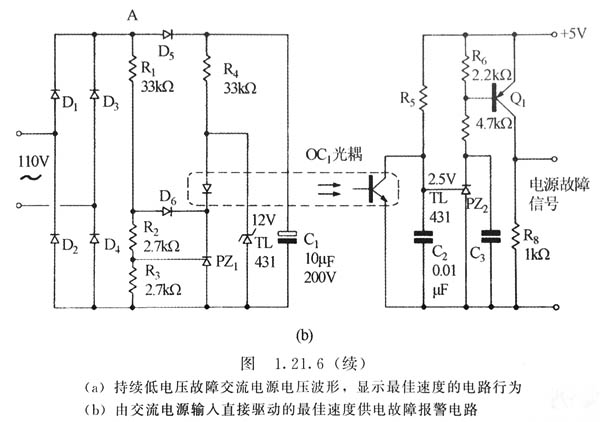這個時序脈沖由C1、R以及副邊電壓(在本例中是5V)來決定。在每個半波周期內,OC1關斷,C2充電,充電時間是從A點電壓下降且穿過50V的下降時刻開始直到A點電壓再一次上升并穿過50V的時刻為止的這段時間。由圖1。21。6a所示可知,如果OC的關斷時間過長,那么在C2上的充電斜波電壓將超過2。5V,這時PZ2導通,跟著Q1也導通,輸出一個供電故障信號。光電耦合器件用來隔離檢測電路與輸出故障信號電路。