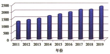 在我國電源適配器領域的年產值經營規模在2019年突破千億元,之后的市場容量就始終呈逐漸增漲發展趨勢。2011年,在我國電源適配器領域年產值經營規模加快速度增漲至1304億人民幣,同比增加11.26%;2015年,電源適配器領域實現年產值1819.97億人民幣,同比增長7.54%;到2016年年產值達l980.14億人民幣左右;2017年達2164.24億人民幣左右;2018年電源適配器商品領域市場容量繼續增漲;2019年,其市場容量更是達到2400億人民幣,如圖4所示。2011—2019年,銷售市場增速保持在10%以上。2019年全國電源適配器商品銷售市場廠家均衡發展,領域呈現出良好的發展態勢。電源適配器領域可以說是在我國為數不多的常青領域之一。近年來,其年產值經營規模始終保持平穩增漲。但因為原材料和元器件的制約,電源適配器商品技術并沒有得到本質的提升,未來發展可能會面臨瓶頸期。必須研發新材料、新設計工藝、新器件等給電源適配器相關技術帶來一場革新。