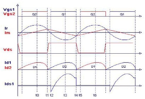 一、LLC的英文全稱是Logical Link Control的縮寫,意為:邏輯鏈路控制。 LLC半橋諧振電路的開關動作和半橋電路無異,但是由于諧振腔的加入,LLC半橋諧振電路中的上下MOSFET 工作情況大不一樣,它能實現MOSFET的零電壓開通。其工作波形如圖2所示: ![]() 圖中,Vgs1和Vgs2分別是Q1、Q2的驅動波形,Ir為諧振電感Lr電感電流波形,Im為變壓器漏感Lm電流波形,Id1和Id2分別是次級側輸出整流二級管波形,Ids1則為Q1導通電流。 波形圖根據不同工作狀態被分成6個階段,下面具體分析各個狀態,LLC諧振電路工作情況: 1) T0~T1:Q1關斷、Q2開通;這個時候諧振電感上的電流為負,方向流向Q2。 在此階段,變壓器漏感不參加諧振,Cr、Lr組成了諧振頻率,輸出能量來自于Cr和Lr。這個階段隨著Q2關斷而結束。下圖1-3為LLC半橋諧振電路在T0~T1工作階段各個元器件工作狀態。 2) T1~T2:Q1關斷、Q2關斷;此時為半橋電路死區時間,諧振電感上的電流仍 為負,諧振電流對Q1的輸出電容(Coss)進行放電,并且對Q2的輸出電容(Coss)進行充電,直到Q2的輸出電容的電壓等于輸入電壓(Vin),為Q1下次導統創造零電壓開通的條件。由于Q1體二級管此是出于正向偏置,而Q2的體二級管示反相偏置,兩個電感上的電流相等。輸出電壓比變壓器二次側電壓高,D1、D2處于反偏狀態,所以輸出端與變壓器脫離。此階段,Lm和Lr、Cr一同參加諧振。隨著Q1開通,T1~T2階段結束。下圖1-4為LLC半橋諧振電路在T1~T2工作階段各個元器件工作狀態。 3) T2~T3:Q1開通、Q2關斷(一旦Q1的輸出電容被放電放到零時)。此時諧振 電感上的電流仍舊為負,電流經Q1的體二級管流回輸入端(Vin)。同時,輸出整流二級管(D1)導通,為輸出端提供能量。變壓器漏感(Lm)在此階段被持續充電。只有Lr和Cr參與諧振。一旦諧振電感Lr上的電流為零時,T2~T3階段結束。下圖1-5為LLC半橋諧振電路在T2~T3工作階段各個元器件工作狀態。 4) T3~T4:此階段始于諧振電感Lr電流變負為正,Q1開通、Q2關斷,和T2~T3 階段一樣。諧振電感電流開始從輸入端經Q1流向地。變壓器漏感Lm此時被此電流充電,因此參加諧振的器件只有Lr和Cr。輸出端仍由D1來傳輸能量。隨著Q1關斷,T3~T4階段結束。下圖1-6為LLC半橋諧振電路在T3~T4工作階段各個元器件工作狀態。 5) T4~T5:Q1關斷,Q2關斷;此時為半橋電路死區時間。此時,諧振電感電流對Q1的輸出電容Coss進行充電,并對Q2的輸出電容Coss進行放電直到Q2上輸出電容電壓為零,導通Q2的體二級管,為Q2零電壓開通創造條件。在此期間,變壓器二次側跟T1~T2階段一樣,脫離初級側。在死去時間,變壓器漏感Lm參與諧振。此階段隨著Q2開通而結束。下圖1-7為LLC半橋諧振電路在T4~T5工作階段各個元器件工作狀態。 6) T5~T6:Q1關斷,Q2導通。由于T4~T5階段中Q2的輸出電容已經被放電至零, 因此T5~T6階段Q2以零電壓開通。能量由諧振電感Lr經Q2續流,輸出端由D2提供能量。此時,Lm不參與Lr和Cr的諧振。此階段隨著諧振電感Lr電流變為零而結束,重復T0~T1狀態。下圖1-8為LLC半橋諧振電路在T5~T6工作階段各個元器件工作狀態。 二、LLC諧振轉換器中的輸出電壓調節 對于采用零電壓開關的諧振轉換器,在設計諧振電路時必須確保電流波形始終滯后于電壓波形。這種情況在負載為電感型時發生,并且頻率高于諧振頻率。在增益特性方面,電壓增益隨頻率下降。控制電路可通過改變輸入方波的頻率來調節輸出電壓,這會改變系統增益,從而產生調節過的輸出電壓。 理想的情況是,增益特性與負載條件無關,而且增益和頻率范圍都應該很易于調節。可惜的是,這些特性都極難實現。以標準諧振轉換器為例,串聯諧振轉換器的負載范圍很窄,因為增益特性隨負載變化很大;而并聯諧振轉換器的輸入電壓范圍很窄,輕載下效率也很低。LLC轉換器則可以避免這些問題。 標準諧振轉換器中有兩個組件決定諧振頻率:電感 (L) 和電容 (C)。LLC轉換器是串聯諧振轉換器,有一個額外的電感 (L) 與其它兩個組件串聯,故名為L-L-C轉換器。圖1所示的諧振電路即是一個LLC轉換器電路。在該電路中,Cr 為諧振電容。兩個電感值分別為集成式變壓器的勵磁電感(Lm) 和總漏電感 (Llkp 加 Llks)。在某些情況下,第二個電感值可以由一個外部獨立電感來實現,這種通常用于更高的功率級。 相比其他諧振轉換器,LLC 轉換器在變化負載條件下具有良好的調節性能。它要求線路輸入電壓控制良好,故一般需要PFC 前端高性能工作。業界對它的了解遠不及雙管正激拓撲。它的頻率范圍比雙管正激拓撲寬,但比其它諧振轉換器要窄得多。 圖2顯示了一個LLC轉換器的增益特性。在增益與頻率的關系圖中,給出了不同負載條件下的增益曲線。LLC 轉換器有兩個諧振頻率。如箭頭所指,較低的諧振頻率在60kHz左右;較高的則為100kHz。所有曲線,不論負載如何,都相交于第二個諧振頻率處。 對于這種設計,諧振頻率下的增益為1.2。因此如果輸出電壓設定為12V、匝數比為40:1,那么這將出現在400V輸入電壓下。不論負載如何,忽略損耗情況,頻率將保持不變。 為了便于說明,我們假設輸入電壓上升到480V,這時控制電路必需把增益降低到1.0,才能保持12V的輸出電壓。在這種情況下,頻率將在滿載下的115kHz和 20% 負載條件下的130kHz之間變化,從圖中可看出,正是對應的負載條件下的增益曲線與增益=1.0這條線相交處的頻率。 這顯示出當偏離設計的輸入工作電壓時, 頻率便會發生一些變化,輕負載下開關損耗就