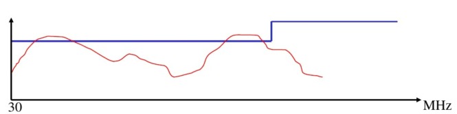 寬帶噪聲抑制方法 譜線問題描述: 30~300MHz頻段內(nèi)出現(xiàn)寬帶噪聲超標(biāo), 如下圖: