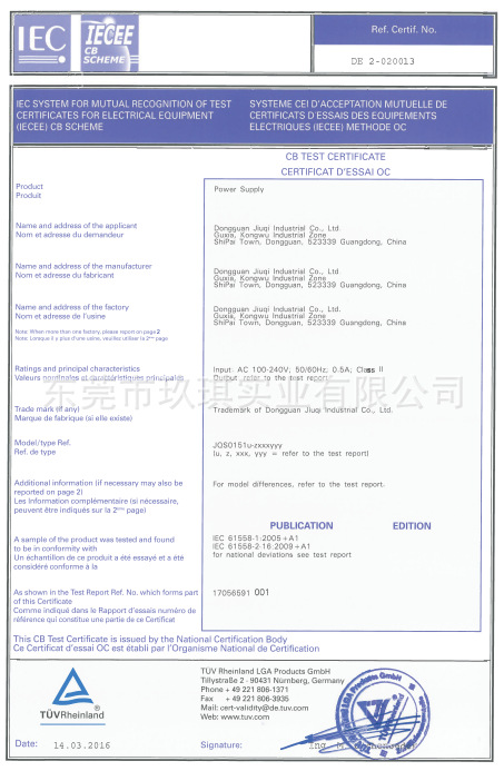 CB安規(guī)證書-15W系列電源適配器